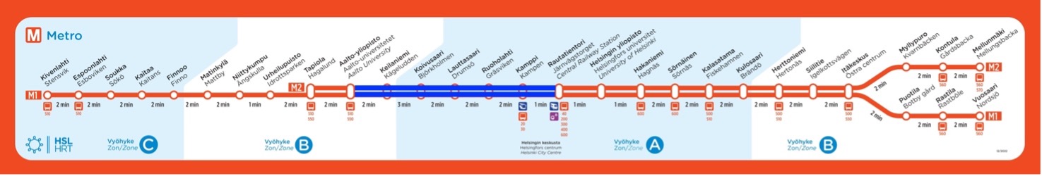 Metro line M1 or M2 from Helsinki main station to Aalto University station, travel time 12 min.